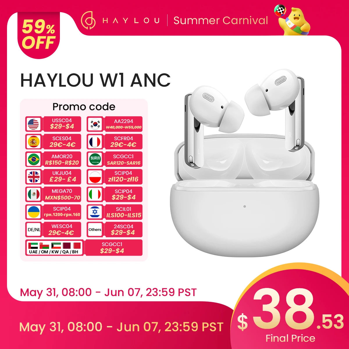 HAYLOU W1 ANC True Wireless Earbuds -45dB ANC Bluetooth 5.3 Headset Premium