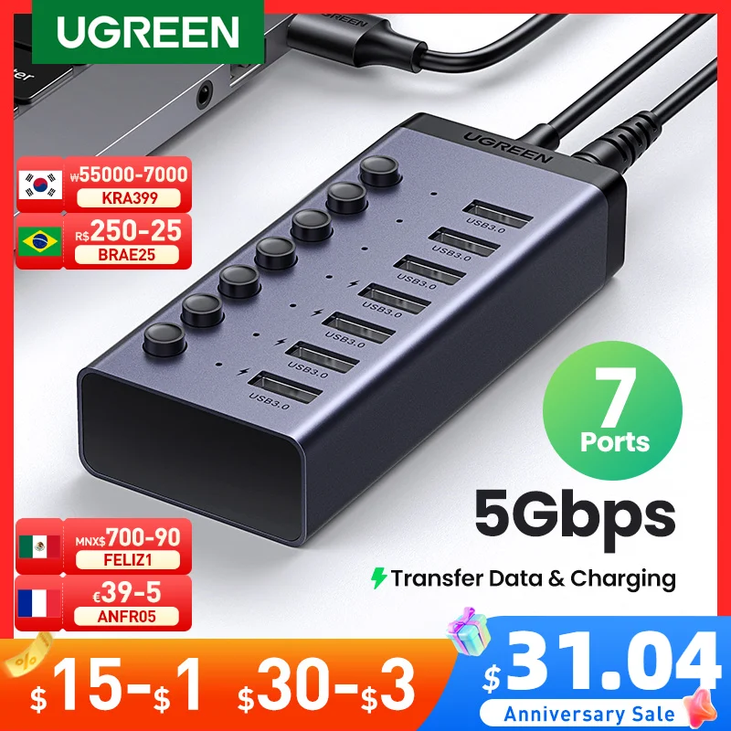 UGREEN USB C Hub 5Gbps 7 Ports USB3.0 Splitter with Individual OFF/ON